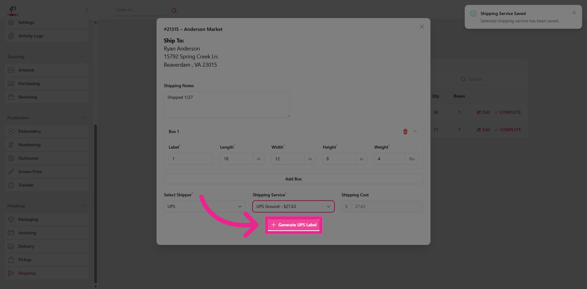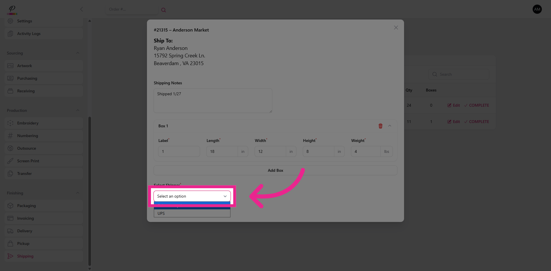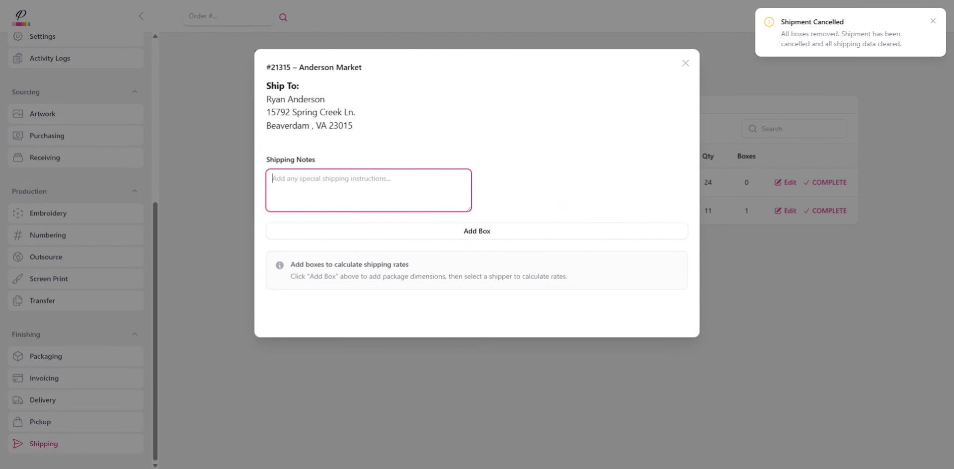 Here in the pop-up window, you will see the address that was entered when the order was created. You will also see any shipment notes that were added, and you can add additional notes as needed.