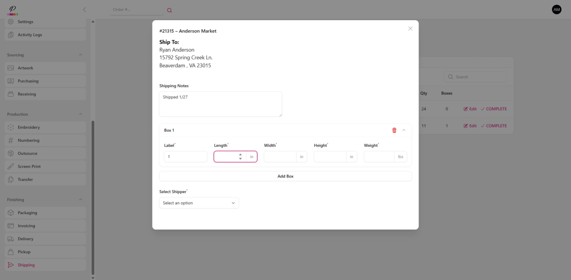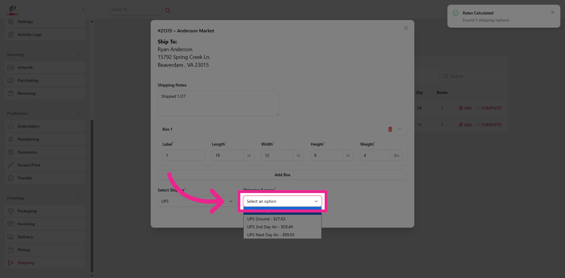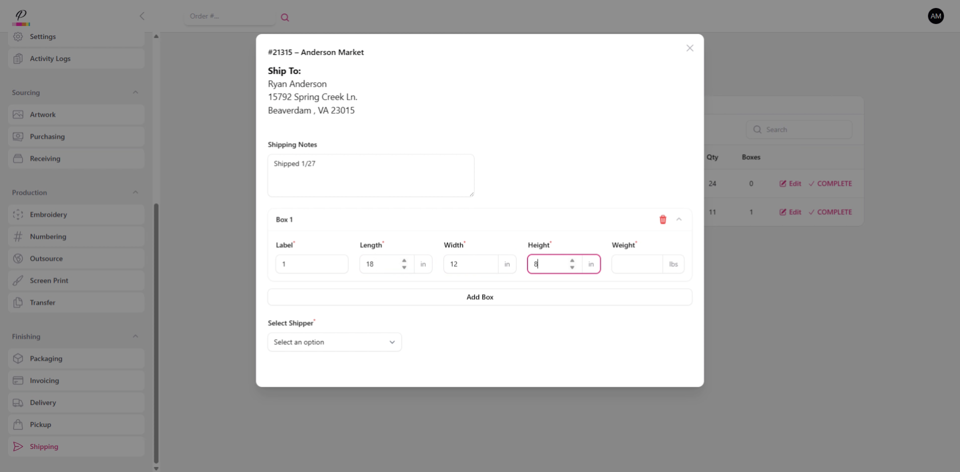 Here in the pop-up window, you will see the address that was entered when the order was created. You will also see any shipment notes that were added, and you can add additional notes as needed.