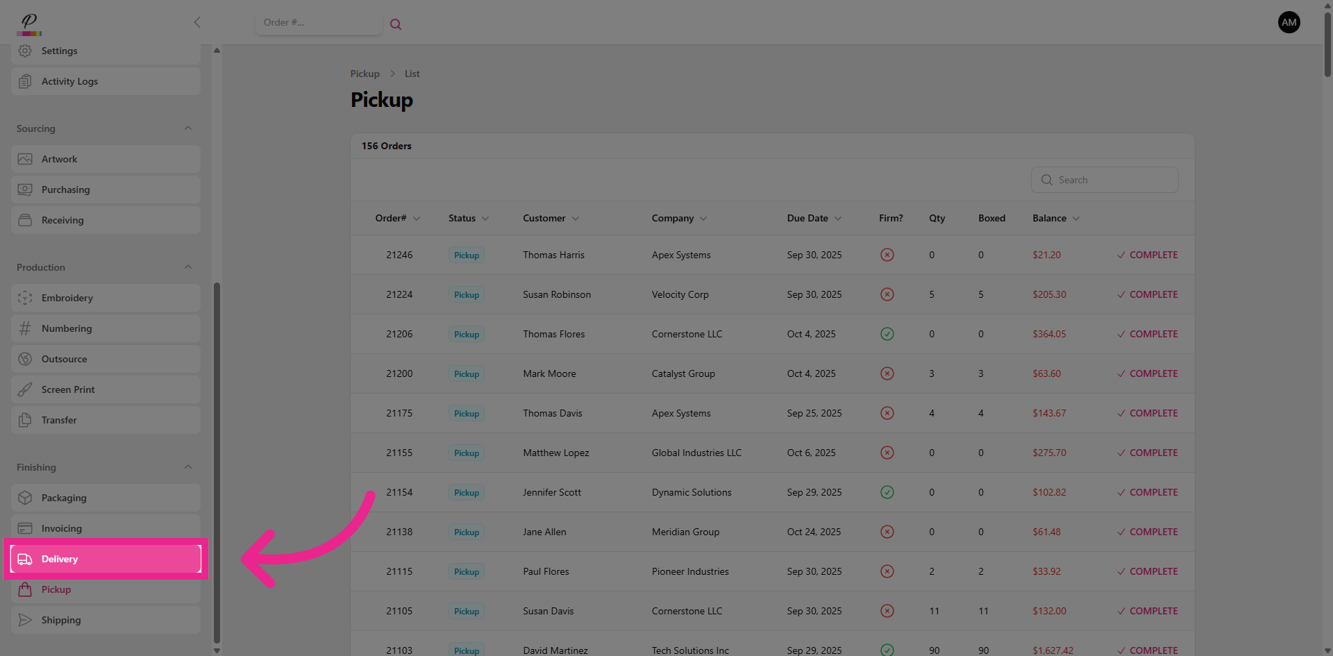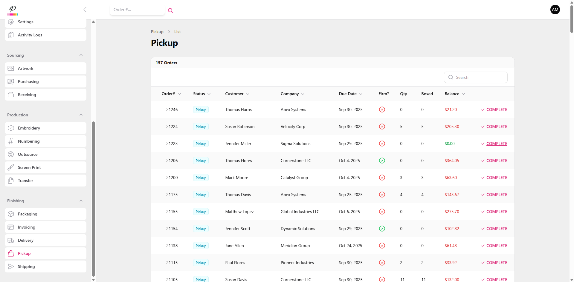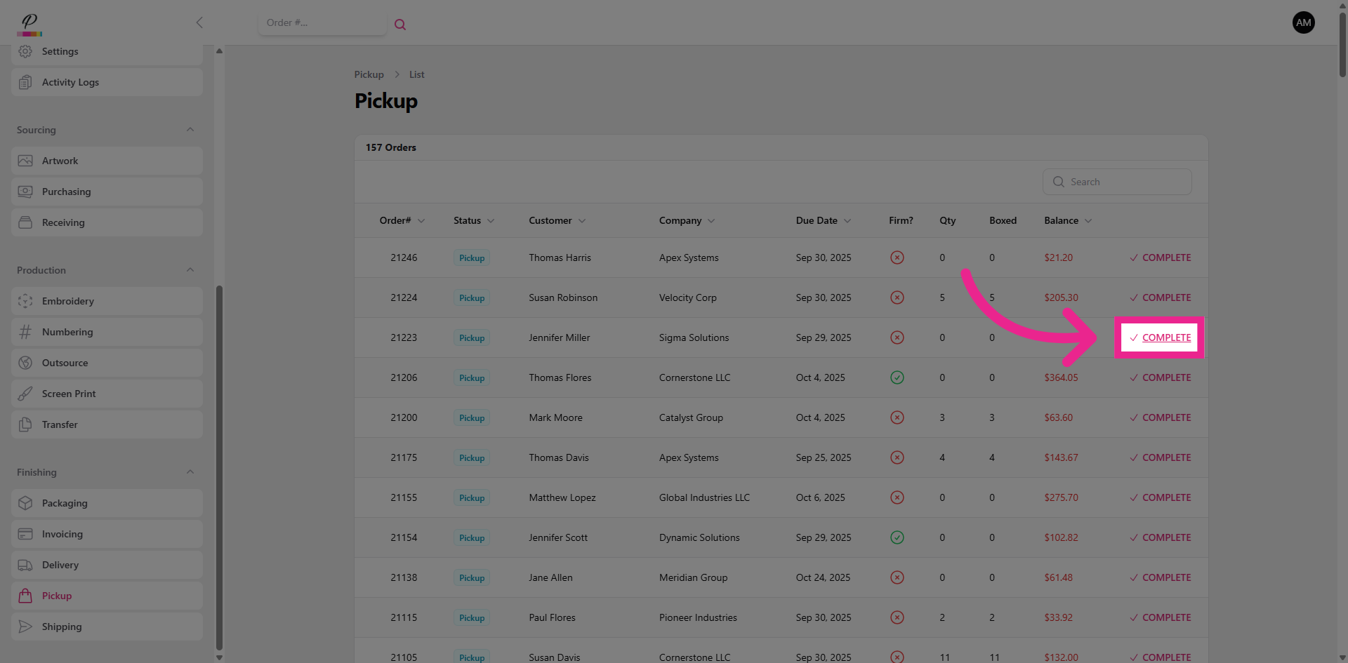 Here you will see the list of orders that are waiting to be picked up by the customer. They will receive an email notification once the order status has been updated to pickup. You will also be able to see if the customer has a remaining balance on the order and notify them when they pick up their order.