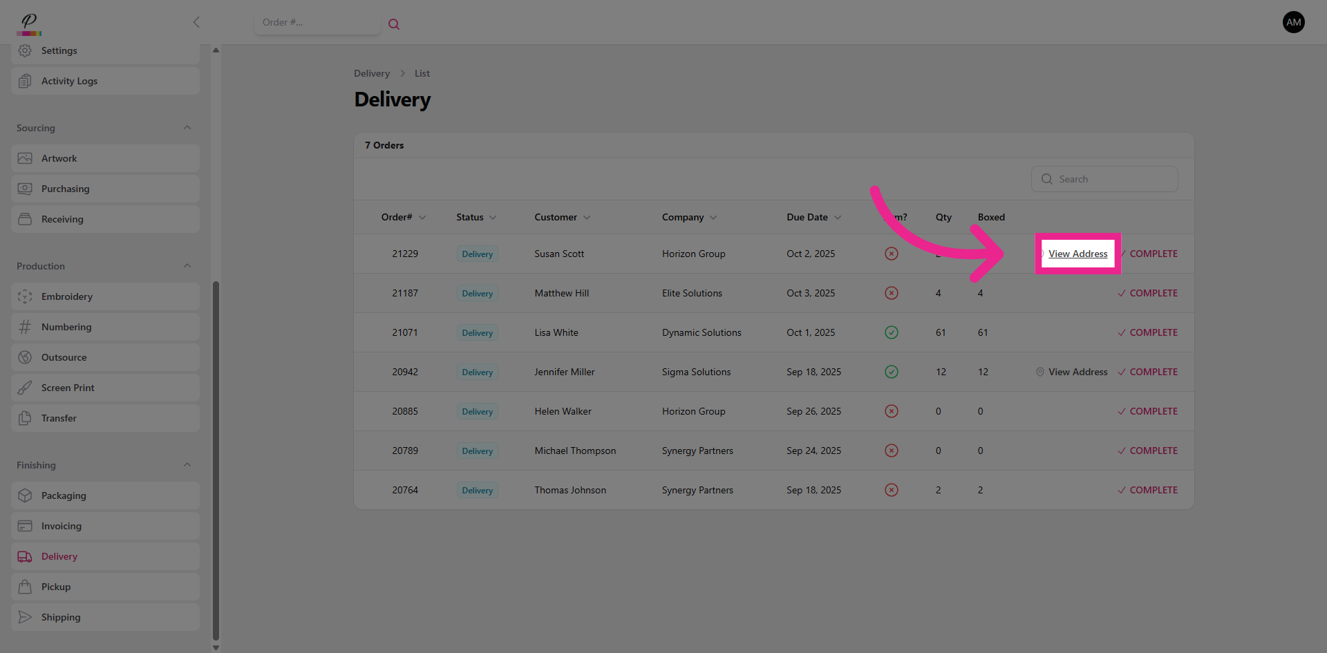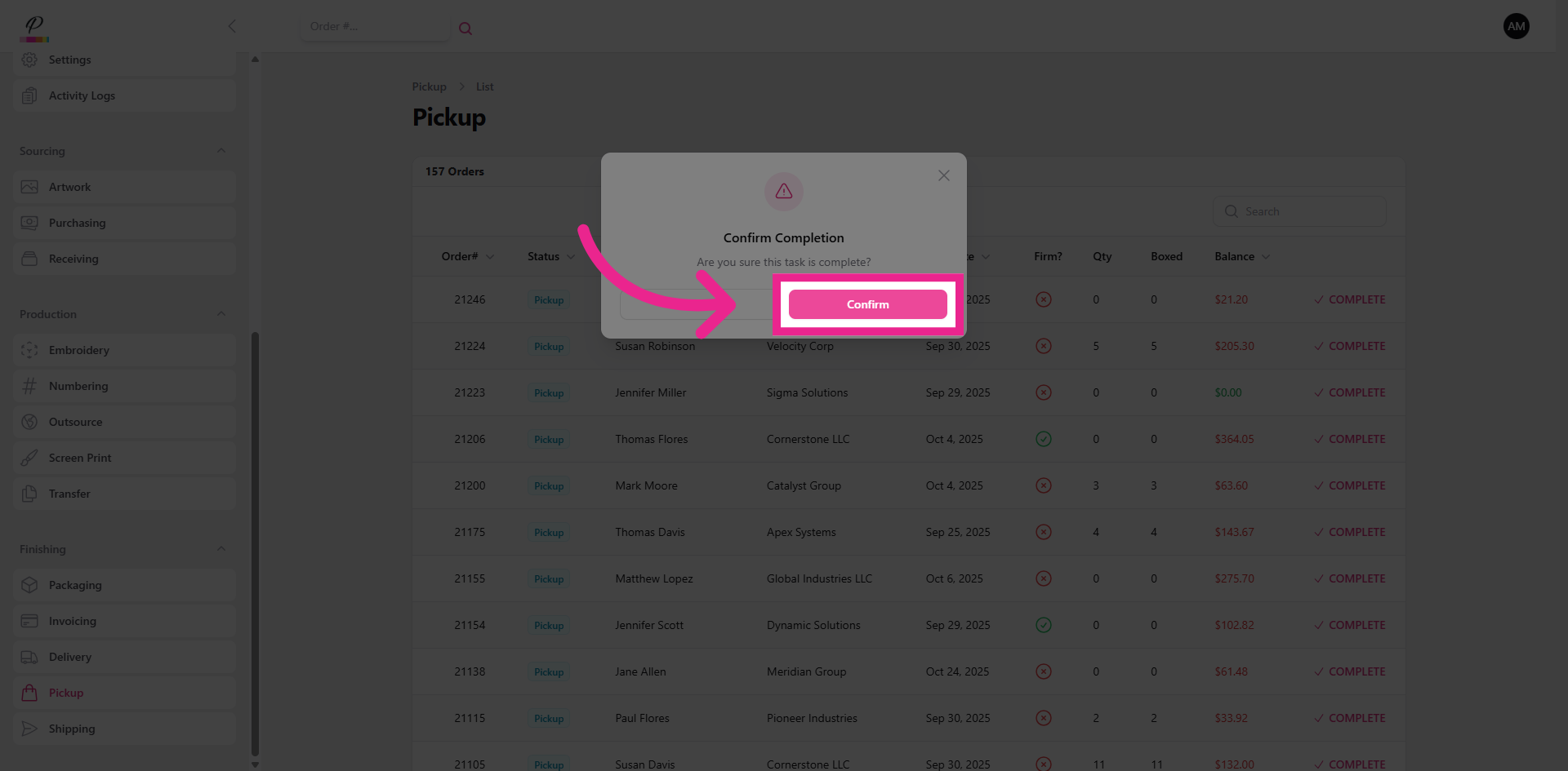 Once delivery has been confirmed, clear the order out of the queue to update the order status to complete.