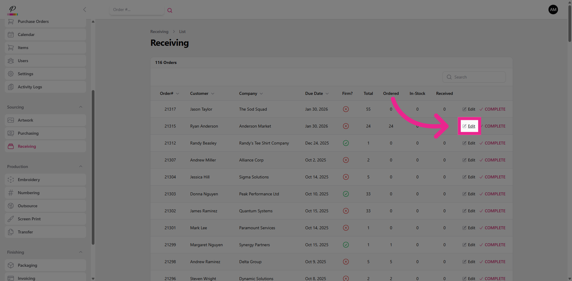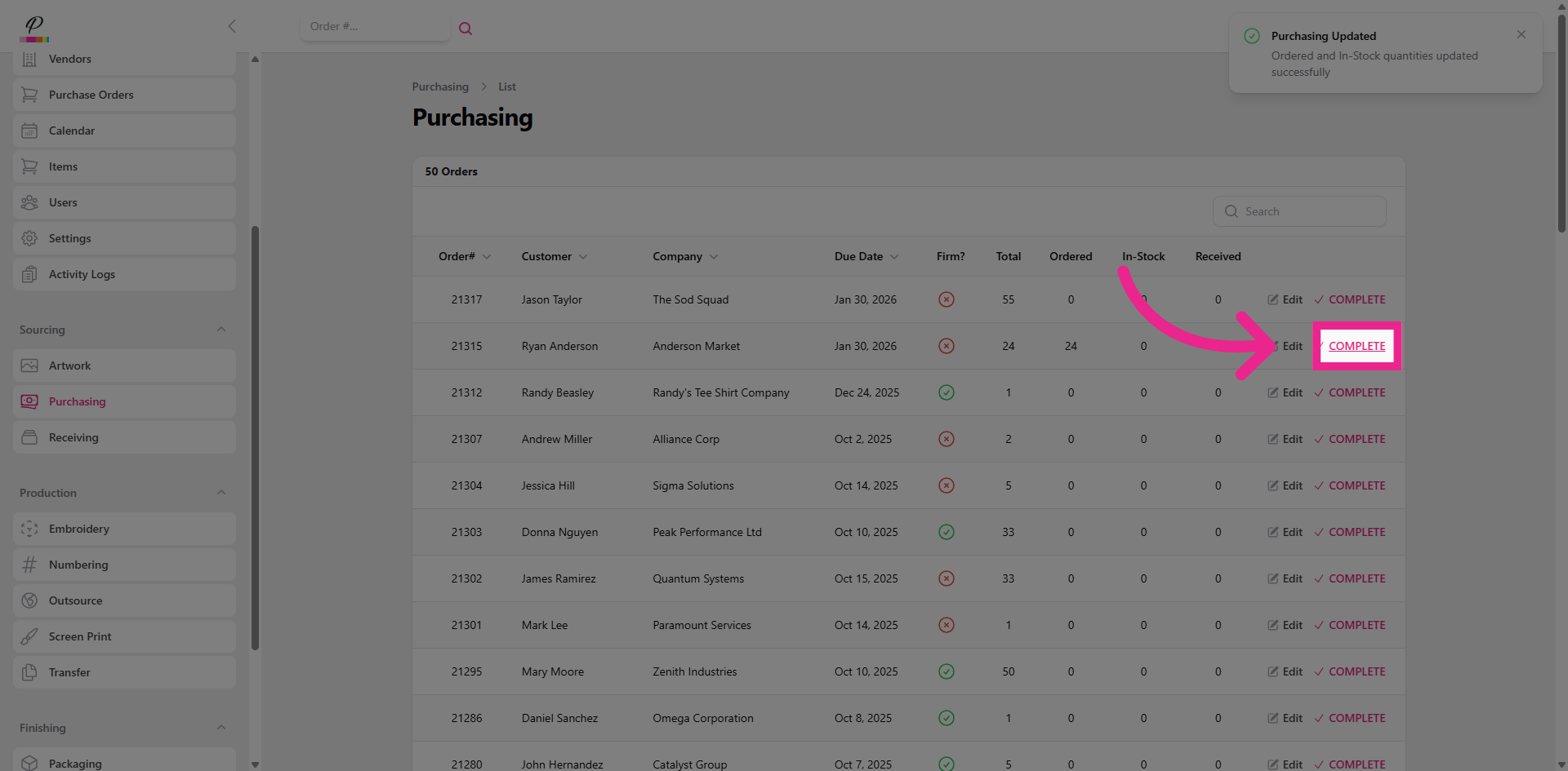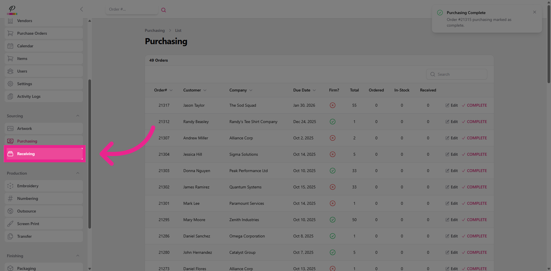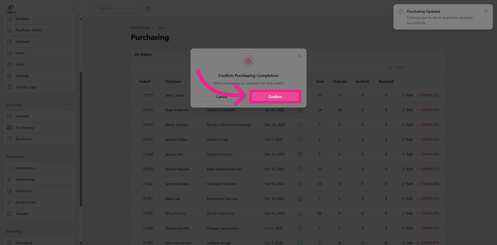 and confirm. Success. Once both purchasing and receiving departments are finished with the order, if artwork has been completed, the order will move forward into production